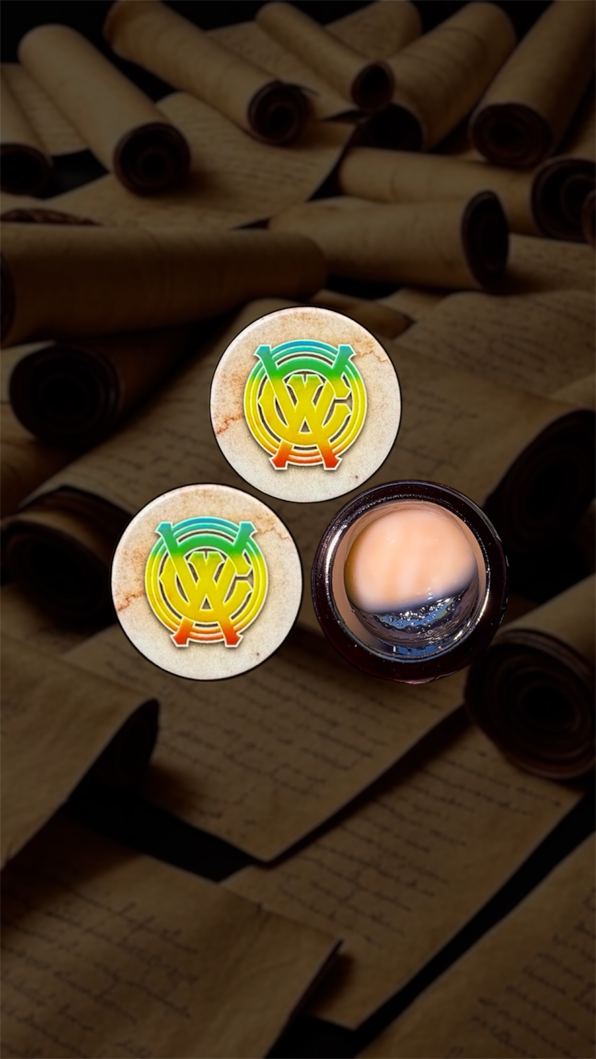 The jar design was cool too, featuring a light brown wraparound label that resembled an aged scroll, with the name βVintage Zβ in rainbow lettering. The top sticker matched the theme, showcasing the West Coast Alchemy logo in rainbow colors against that same aged scroll background. 8.9/10